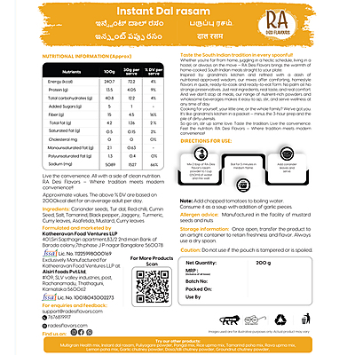 Ingredients: Toor dal (30%), Rasam powder (Coriander seeds, red chilli, Cumin seeds, Fenugreek seeds, Pepper, Salt, Mustard, Turmeric, Asafoetida, Curry leaves), Salt, Tamarind concentrate, Jaggery, Curry leaves, Turmeric powder